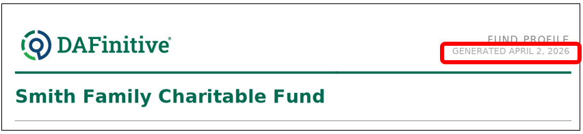 At the very top right corner of the profile, each PDF will be stamped with the date the profile was generated: